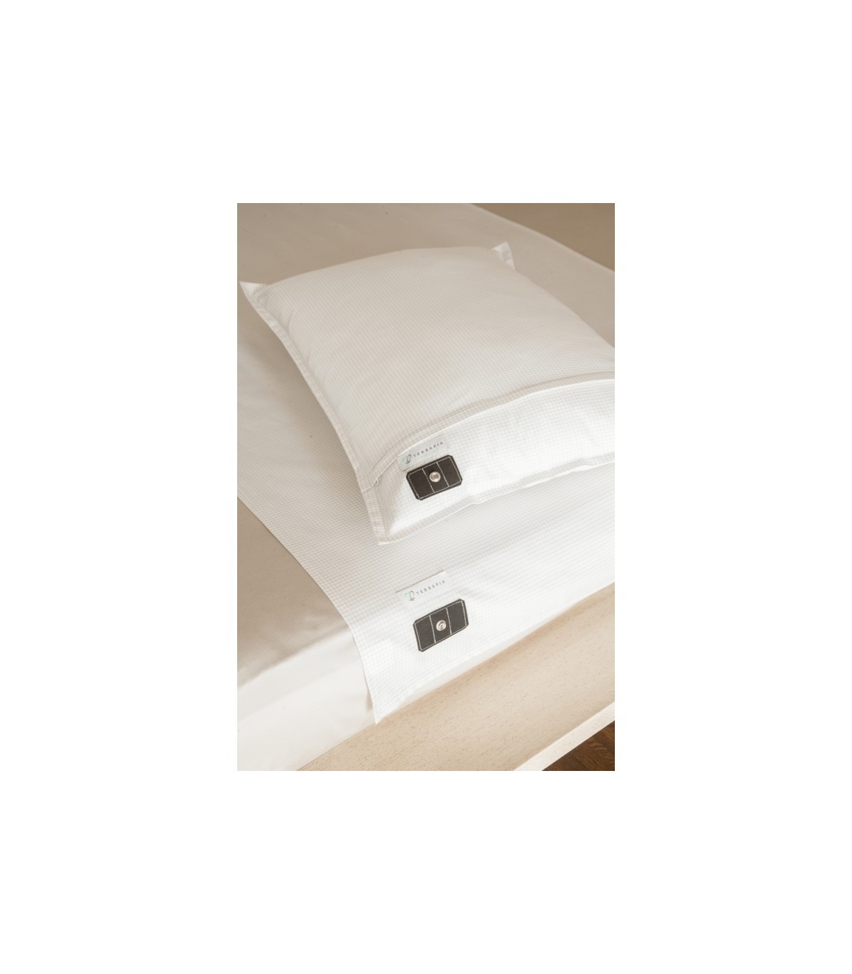 W skład materiału wchodzi 98% bawełny oraz 2% srebrnego włókna. Srebrne nici zostały wplecione bardzo gęsto, tworząc wzór drobnej, podwójnej kratki. Widoczna szara siatka to przewodząca struktura, która – po podłączeniu poszewki do instalacji z uziemieniem – umożliwia wymianę ładunków elektrostatycznych między ciałem a Ziemią.