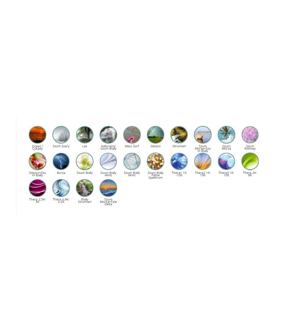 - Warianty szumu białego: 4000 Hz, 6000 Hz, pełne spektrum 1000–10 000 Hz